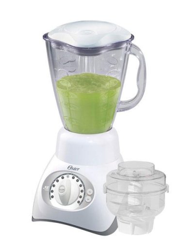 - Oster 12-speed blender and food processor/chopper combo; sleek white looks stylish in modern kitchens